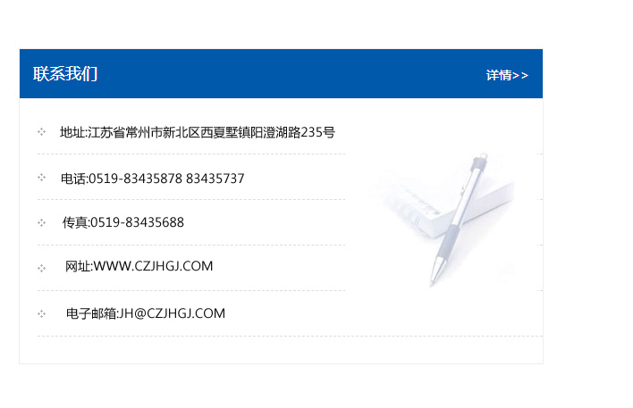 地址:常州市新北區友邦商務大廈1幢16、17層  電話:0519-85101652  傳真:0519-85112595  郵編:213022  網址:www_cz-jiayue_cn.gzczzc.com  郵箱:xiajifengaa@163.com